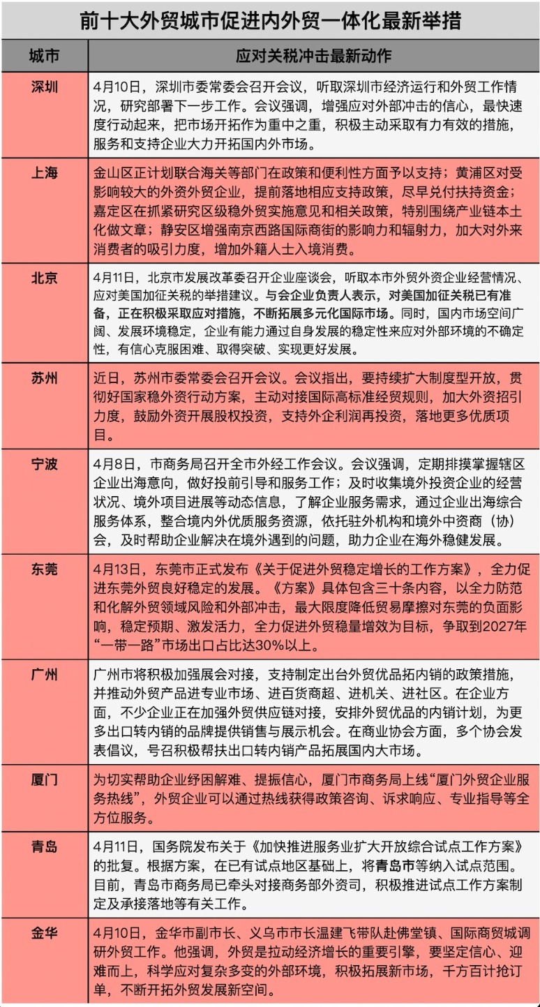 另外,连日来,上海多个区主要领导纷纷调研辖区重点外贸企业,进一步帮助外资外贸企业拓展发展路径,释放更多内部潜力;4月11日,北京市发展改革委也召开企业座谈会,听取本市外贸外资企业经营情况、应对美国加征关税的举措建议。
