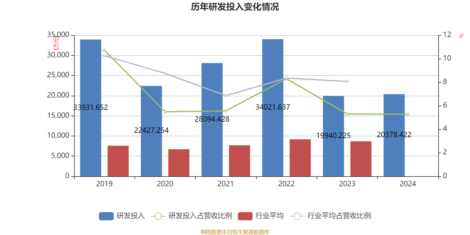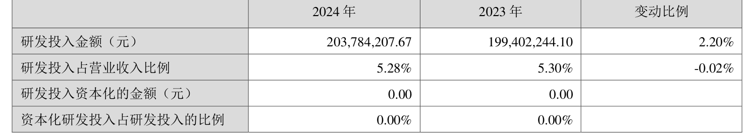 2024年全年,公司研发投入金额为2.04亿元,同比增长2.2%;研发投入占营业收入比例为5.28%,相比上年同期下降0.02个百分点。此外,公司全年研发投入资本化率为0%。