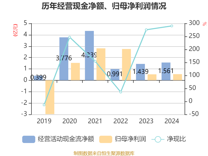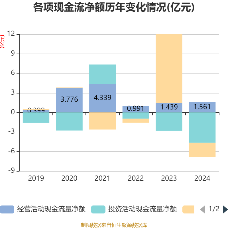 截至2024年,公司经营活动现金流净额为1.56亿元,同比增长8.43%;筹资活动现金流净额-2.18亿元,同比减少12.74亿元;投资活动现金流净额-4.66亿元,上年同期为-2.83亿元。