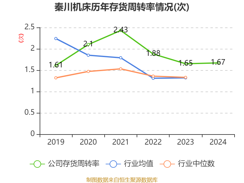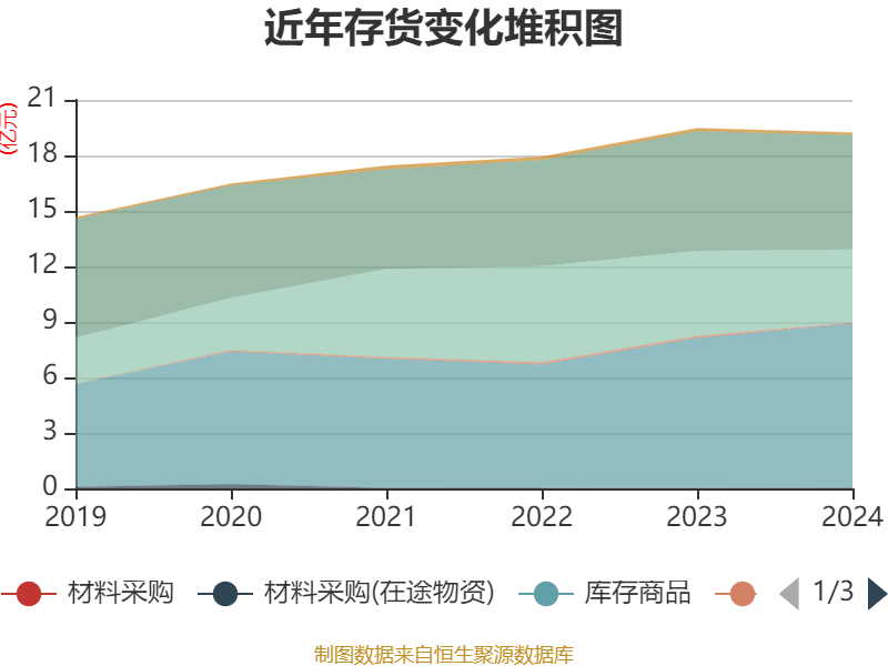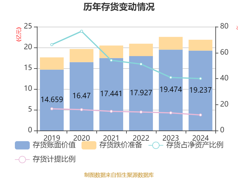 从存货变动来看,截至2024年末,公司存货账面价值为19.24亿元,占净资产的40.04%,较上年末减少2375.59万元。其中,存货跌价准备为2.62亿元,计提比例为12%。