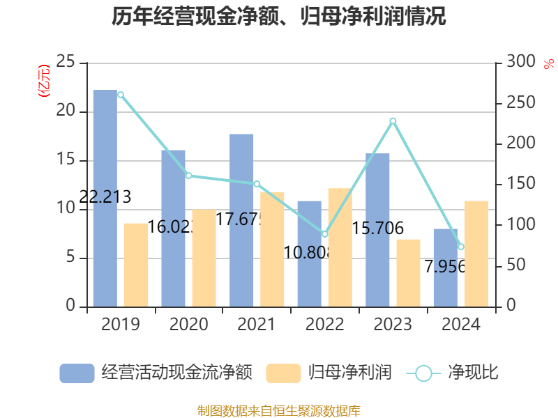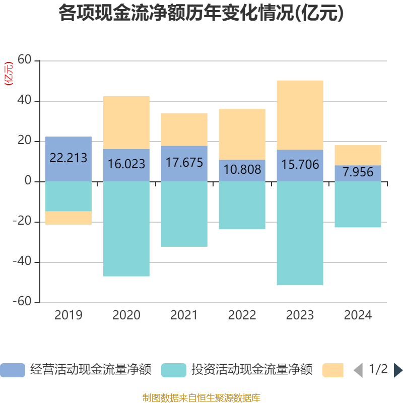 截至2024年,公司经营活动现金流净额为7.96亿元,同比下降49.35%;筹资活动现金流净额10.02亿元,同比减少24.34亿元;投资活动现金流净额-22.83亿元,上年同期为-51.55亿元。