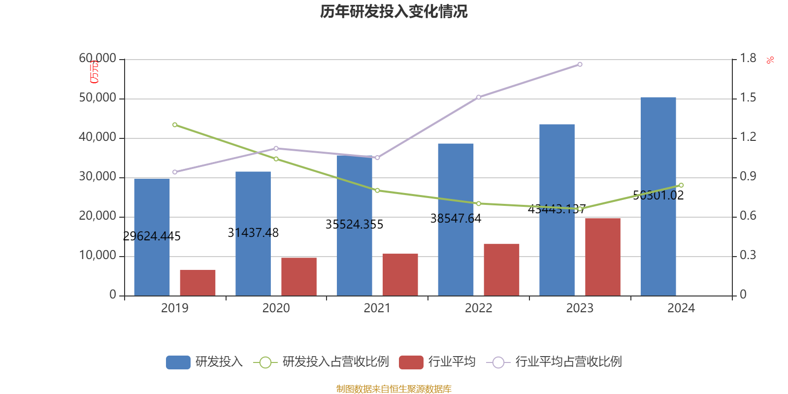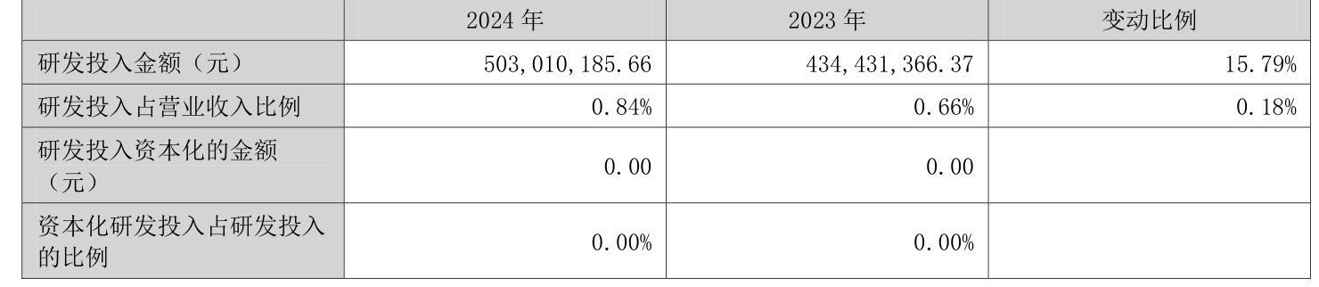 2024年全年,公司研发投入金额为5.03亿元,同比增长15.79%;研发投入占营业收入比例为0.84%,相比上年同期上升0.18个百分点。此外,公司全年研发投入资本化率为0%。