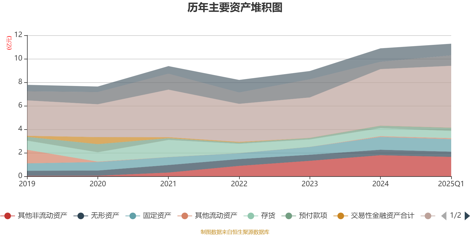 资产重大变化方面,截至2025年一季度末,公司应收票据及应收账款较上年末增加9.32%,占公司总资产比重上升2.44个百分点;货币资金较上年末增加41.8%,占公司总资产比重上升2.13个百分点;其他非流动资产较上年末减少8.22%,占公司总资产比重下降1.88个百分点;一年内到期的非流动资产较上年末减少100%,占公司总资产比重下降1.1个百分点。