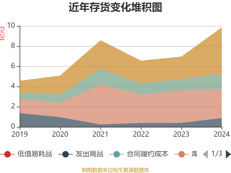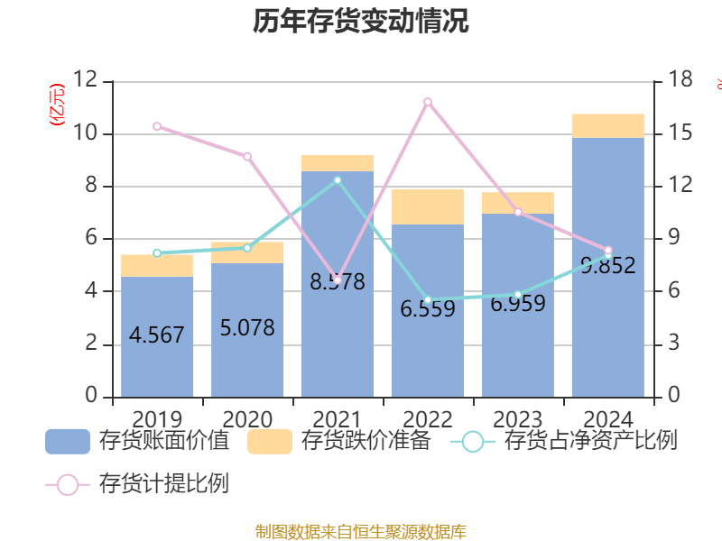 从存货变动来看,截至2024年末,公司存货账面价值为9.85亿元,占净资产的8.06%,较上年末增加2.89亿元。其中,存货跌价准备为8992.26万元,计提比例为8.36%。