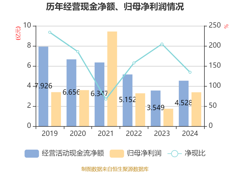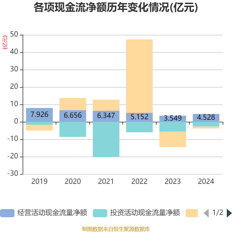 截至2024年,公司经营活动现金流净额为4.53亿元,同比增长27.58%;筹资活动现金流净额-1.1亿元,同比增加7.8亿元;投资活动现金流净额-2.71亿元,上年同期为-5.64亿元。