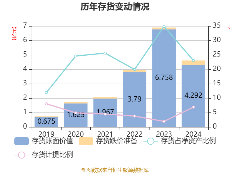 从存货变动来看,截至2024年末,公司存货账面价值为4.29亿元,占净资产的23%,较上年末减少2.47亿元。其中,存货跌价准备为3146.37万元,计提比例为6.83%。