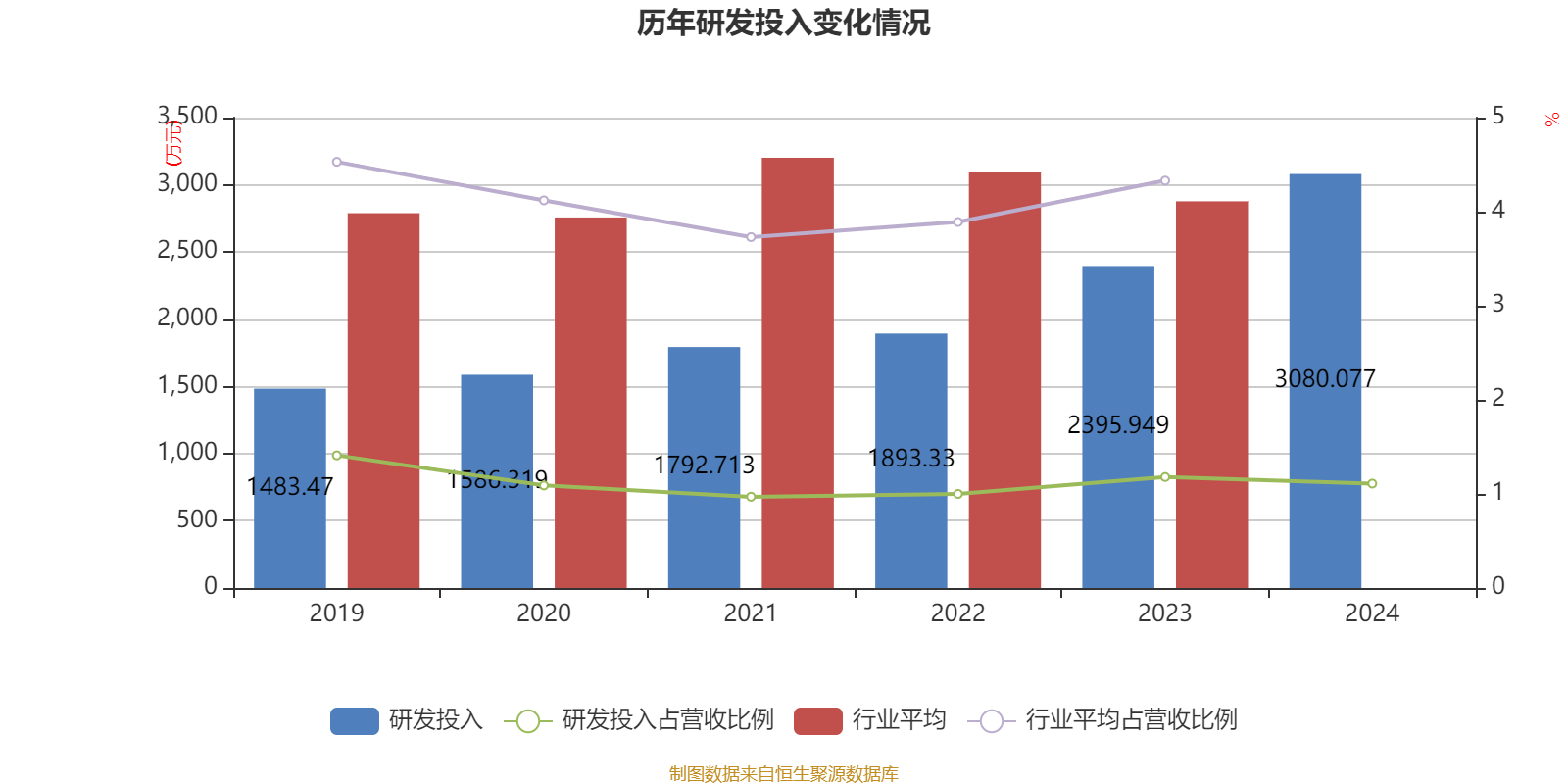2024年全年,公司研发投入金额为3080.08万元,同比增长28.55%;研发投入占营业收入比例为1.11%,相比上年同期下降0.07个百分点。此外,公司全年研发投入资本化率为0%。