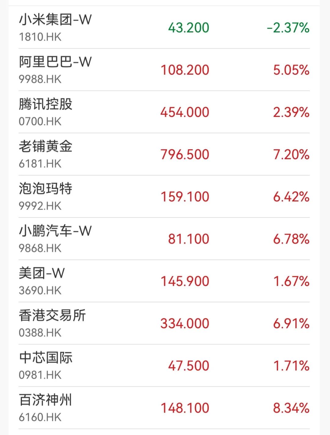 盘面上,大型科技股集体上涨,阿里巴巴涨超5%,百度集团涨4%,网易、京东集团、腾讯涨超2%,但小米集团跌超2%;生物技术股走高,巨子生物、再鼎医药涨超9%,百济神州涨超8%,药明生物涨超6%,康方生物涨超5%;国际金价再创新高,黄金股表现亮眼,潼关黄金涨超19%,老铺黄金涨超7%,山东黄金涨超9%,招金矿业涨超6%再创新高。此外,苹果概念股、芯片股等齐涨。