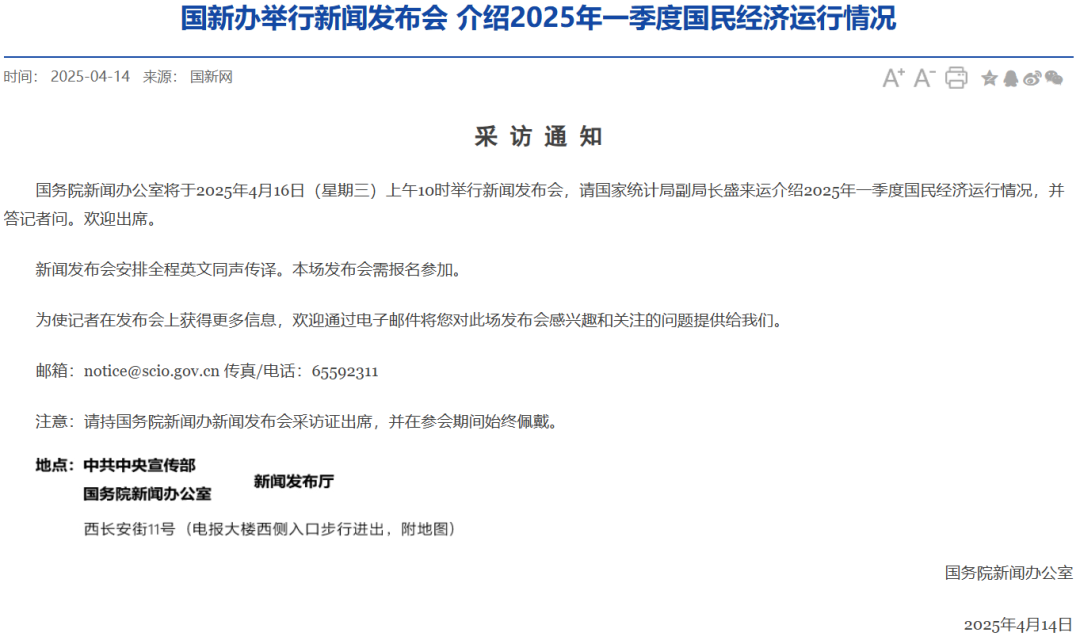 据国新网14日消息,国务院新闻办公室将于2025年4月16日(星期三)上午10时举行新闻发布会,请国家统计局副局长盛来运介绍2025年一季度国民经济运行情况,并答记者问。