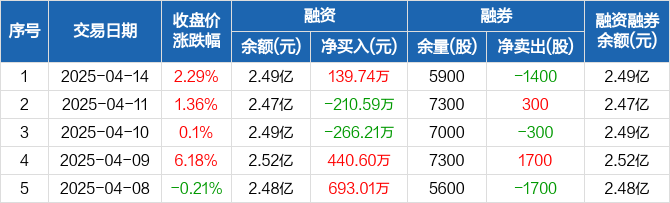 融资方面,当日融资买入440.92万元,融资偿还301.18万元,融资净买入139.74万元。融券方面,融券卖出0股,融券偿还1400股,融券余量5900股,融券余额6.31万元。融资融券余额合计2.49亿元。