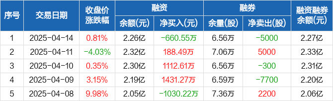 一拖股份融资融券信息显示,2025年4月14日融资净偿还660.55万元;融资余额2.26亿元,较前一日下降2.84%。