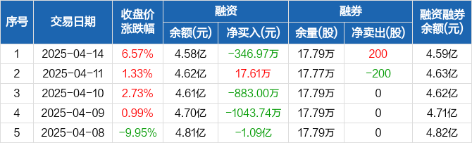 永鼎股份融资融券信息显示,2025年4月14日融资净偿还346.97万元;融资余额4.58亿元,较前一日下降0.75%。