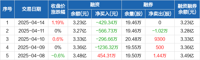 融资方面,当日融资买入1616.72万元,融资偿还2046.06万元,融资净偿还429.34万元,连续4日净偿还累计2529.06万元。融券方面,融券卖出0股,融券偿还0股,融券余量19.46万股,融券余额65.97万元。融资融券余额合计3.23亿元。