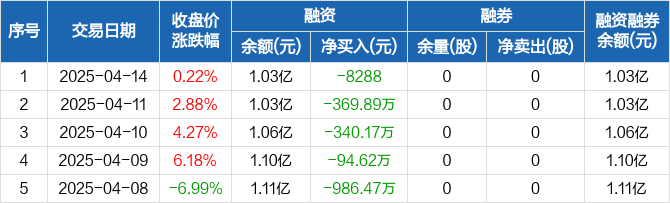 金帝股份融资融券信息显示,2025年4月14日融资净偿还8288元;融资余额1.03亿元,较前一日下降0.01%。