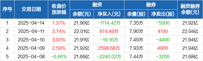 闻泰科技融资融券信息显示,2025年4月14日融资净偿还1114.42万元;融资余额21.9亿元,较前一日下降0.51%。