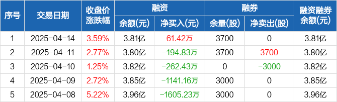 融资方面,当日融资买入1131.09万元,融资偿还1069.66万元,融资净买入61.42万元。融券方面,融券卖出0股,融券偿还0股,融券余量3700股,融券余额2.56万元。融资融券余额合计3.81亿元。