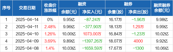 融资方面,当日融资买入2634.17万元,融资偿还2721.41万元,融资净偿还87.24万元。融券方面,融券卖出1500股,融券偿还2.11万股,融券余量16.17万股,融券余额240.26万元。融资融券余额合计9.98亿元。