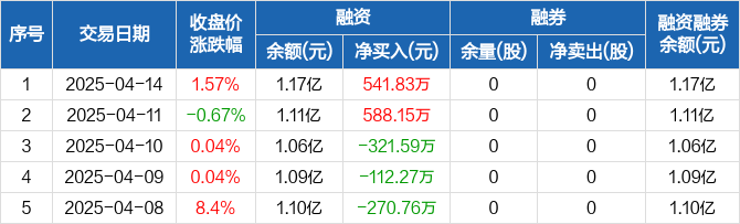 融资方面,当日融资买入1690.77万元,融资偿还1148.94万元,融资净买入541.83万元。融券方面,融券卖出0股,融券偿还0股,融券余量0股,融券余额0元。融资融券余额合计1.17亿元。