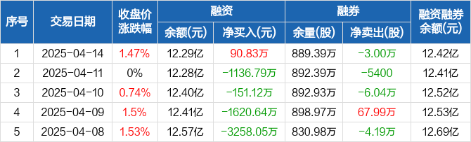 融资方面,当日融资买入1亿元,融资偿还9933.5万元,融资净买入90.83万元。融券方面,融券卖出0股,融券偿还3万股,融券余量889.39万股,融券余额1227.36万元。融资融券余额合计12.42亿元。