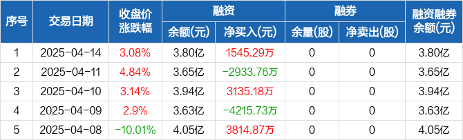 融资方面,当日融资买入6042.09万元,融资偿还4496.79万元,融资净买入1545.29万元。融券方面,融券卖出0股,融券偿还0股,融券余量0股,融券余额0元。融资融券余额合计3.8亿元。