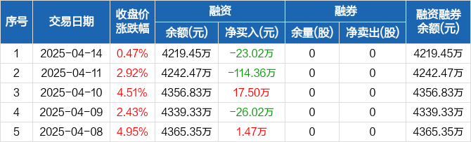 融资方面,当日融资买入86.64万元,融资偿还109.66万元,融资净偿还23.02万元。融券方面,融券卖出0股,融券偿还0股,融券余量0股,融券余额0元。融资融券余额合计4219.45万元。