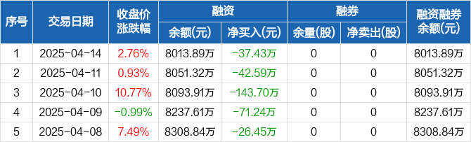 融资方面,当日融资买入611.87万元,融资偿还649.3万元,融资净偿还37.43万元,连续5日净偿还累计321.41万元。融券方面,融券卖出0股,融券偿还0股,融券余量0股,融券余额0元。融资融券余额合计8013.89万元。