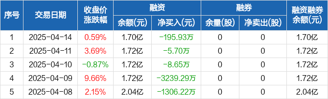 融资方面,当日融资买入4346.85万元,融资偿还4542.78万元,融资净偿还195.93万元,连续5日净偿还累计4755.79万元。融券方面,融券卖出0股,融券偿还0股,融券余量0股,融券余额0元。融资融券余额合计1.7亿元。