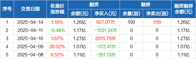 融资方面,当日融资买入2491.78万元,融资偿还1564.71万元,融资净买入927.07万元。融券方面,融券卖出100股,融券偿还0股,融券余量100股,融券余额1043元。融资融券余额合计1.26亿元。