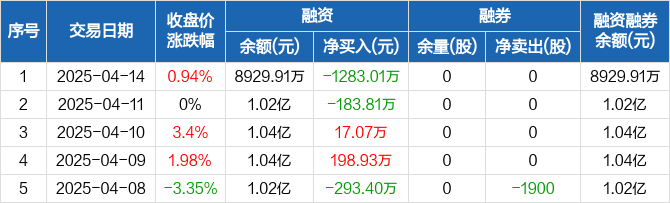 融资方面,当日融资买入99.84万元,融资偿还1382.85万元,融资净偿还1283.01万元。融券方面,融券卖出0股,融券偿还0股,融券余量0股,融券余额0元。融资融券余额合计8929.91万元。