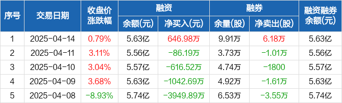 融资方面,当日融资买入3142.97万元,融资偿还2495.99万元,融资净买入646.98万元。融券方面,融券卖出6.23万股,融券偿还500股,融券余量9.91万股,融券余额62.83万元。融资融券余额合计5.63亿元。