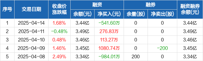 融资方面,当日融资买入1487.75万元,融资偿还2029.35万元,融资净偿还541.6万元。融券方面,融券卖出0股,融券偿还0股,融券余量0股,融券余额0元。融资融券余额合计3.44亿元。