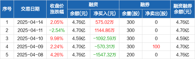 融资方面,当日融资买入4867.06万元,融资偿还4292.04万元,融资净买入575.02万元。融券方面,融券卖出0股,融券偿还0股,融券余量300股,融券余额1644元。融资融券余额合计4.76亿元。