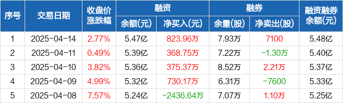 融资方面,当日融资买入4179.21万元,融资偿还3355.25万元,融资净买入823.96万元,连续4日净买入累计2298.25万元。融券方面,融券卖出9400股,融券偿还2300股,融券余量7.93万股,融券余额100.16万元。融资融券余额合计5.48亿元。