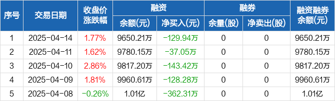 融资方面,当日融资买入513.47万元,融资偿还643.41万元,融资净偿还129.94万元,连续7日净偿还累计2103.87万元。融券方面,融券卖出0股,融券偿还0股,融券余量0股,融券余额0元。融资融券余额合计9650.21万元。