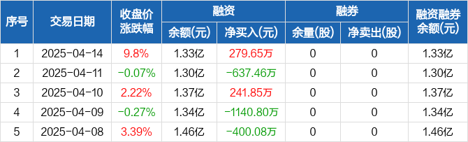 融资方面,当日融资买入3555.61万元,融资偿还3275.96万元,融资净买入279.65万元。融券方面,融券卖出0股,融券偿还0股,融券余量0股,融券余额0元。融资融券余额合计1.33亿元。