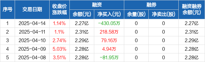 融资方面,当日融资买入1799.92万元,融资偿还2229.97万元,融资净偿还430.05万元。融券方面,融券卖出0股,融券偿还0股,融券余量0股,融券余额0元。融资融券余额合计2.27亿元。