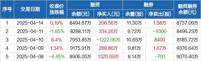 裕同科技融资融券信息显示,2025年4月14日融资净买入206.56万元;融资余额8494.67万元,较前一日增加2.49%。
