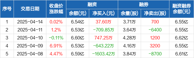 融资方面,当日融资买入3440.22万元,融资偿还3402.61万元,融资净买入37.6万元。融券方面,融券卖出700股,融券偿还0股,融券余量3.71万股,融券余额165.85万元。融资融券余额合计6.55亿元。