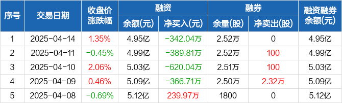 融资方面,当日融资买入772.75万元,融资偿还1114.79万元,融资净偿还342.04万元,连续4日净偿还累计1718.61万元。融券方面,融券卖出0股,融券偿还0股,融券余量2.52万股,融券余额11.31万元。融资融券余额合计4.95亿元。
