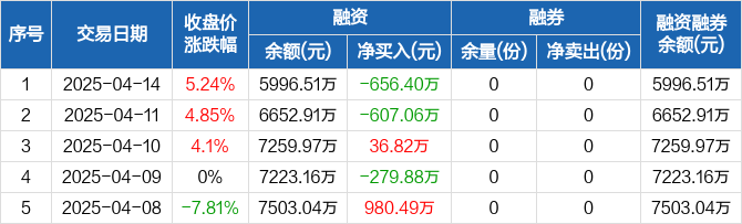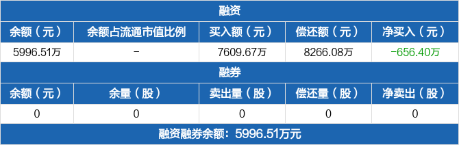 融资方面,当日融资买入7609.67万元,融资偿还8266.08万元,融资净偿还656.4万元。融券方面,融券卖出0份,融券偿还0份,融券余量0份,融券余额0元。融资融券余额合计5996.51万元。