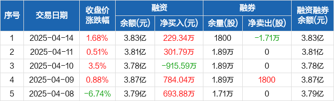 融资方面,当日融资买入1191.62万元,融资偿还962.29万元,融资净买入229.34万元。融券方面,融券卖出0股,融券偿还1.71万股,融券余量1800股,融券余额1.09万元。融资融券余额合计3.83亿元。