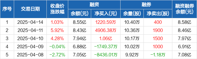融资方面,当日融资买入1.08亿元,融资偿还9602.01万元,融资净买入1220.59万元,连续3日净买入累计1.68亿元。融券方面,融券卖出400股,融券偿还0股,融券余量10.4万股,融券余额306.59万元。融资融券余额合计8.58亿元。