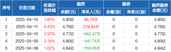 融资方面,当日融资买入1484.45万元,融资偿还1397.66万元,融资净买入86.79万元。融券方面,融券卖出0股,融券偿还0股,融券余量0股,融券余额0元。融资融券余额合计4.8亿元。