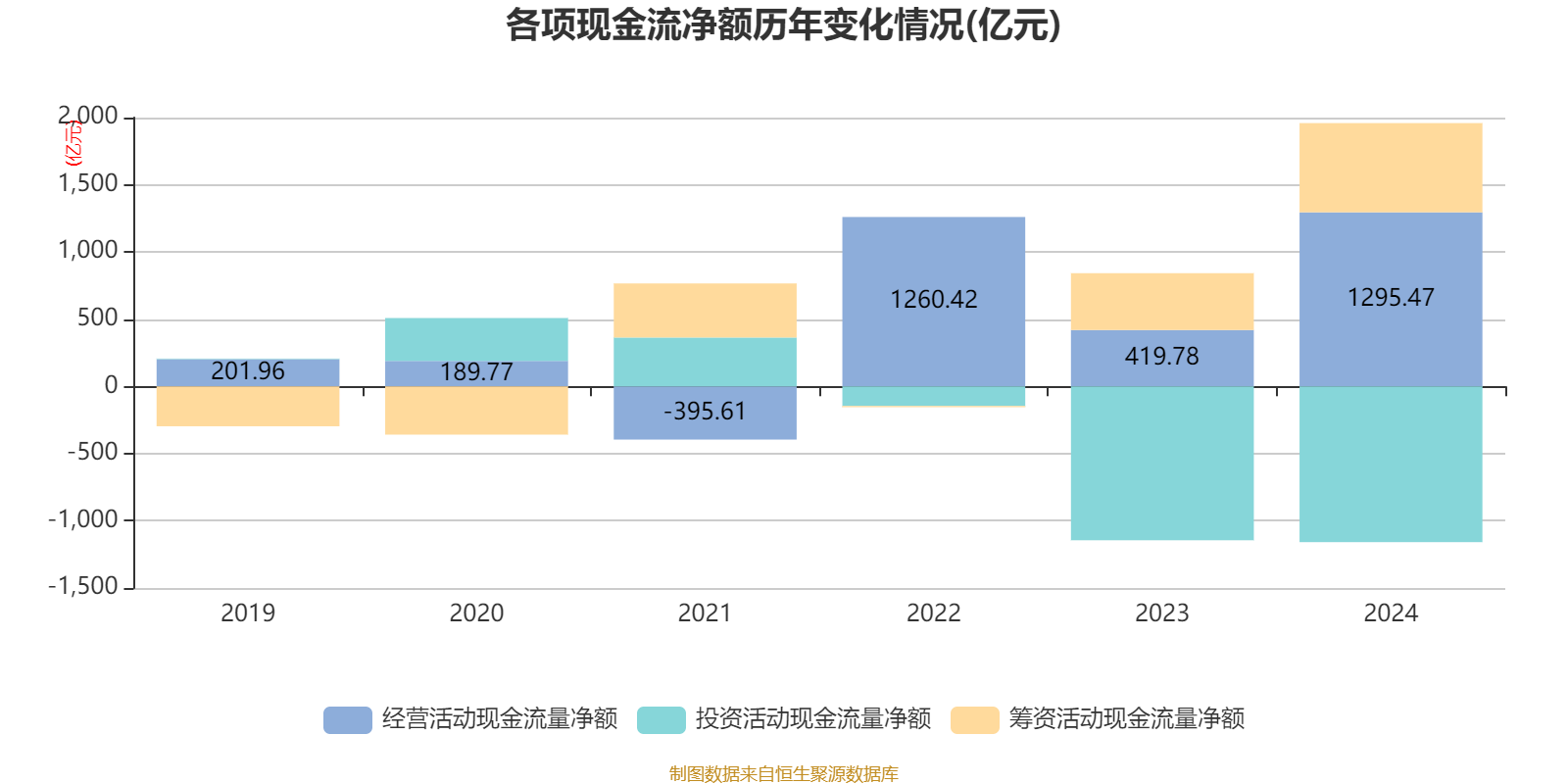 截至2024年,公司经营活动现金流净额为1295.47亿元,同比增长208.61%;筹资活动现金流净额663.58亿元,同比增加241.03亿元;投资活动现金流净额-1158.7亿元,上年同期为-1144.74亿元。