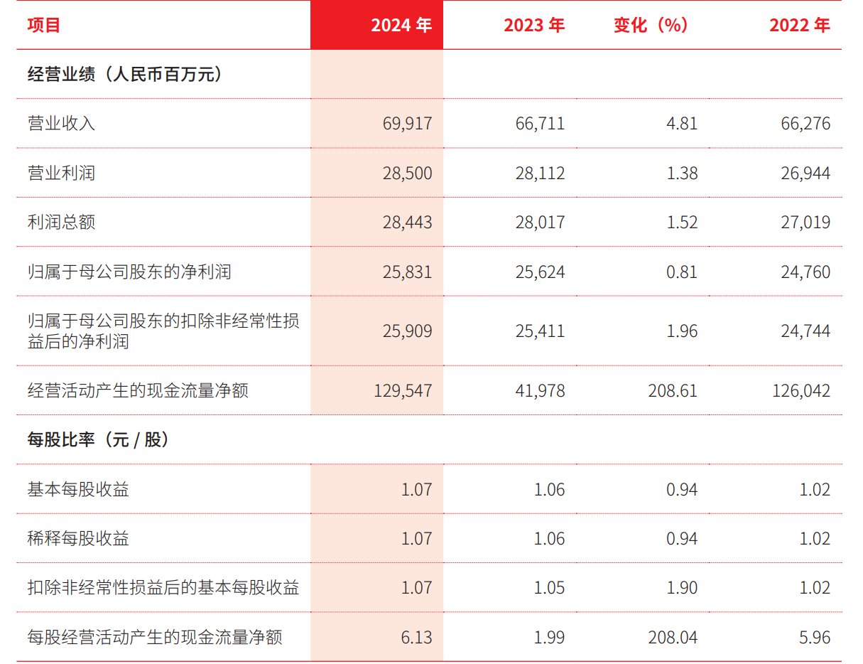 中证智能财讯北京银行(601169)4月15日披露2024年年度报告。2024年,公司实现营业总收入699.17亿元,同比增长4.81%;归母净利润258.31亿元,同比增长0.81%;扣非净利润259.09亿元,同比增长1.96%;经营活动产生的现金流量净额为1295.47亿元,同比增长208.61%;报告期内,北京银行基本每股收益为1.07元,加权平均净资产收益率为8.65%。公司2024年度分配预案为:拟向全体股东每10股派现2元(含税)。