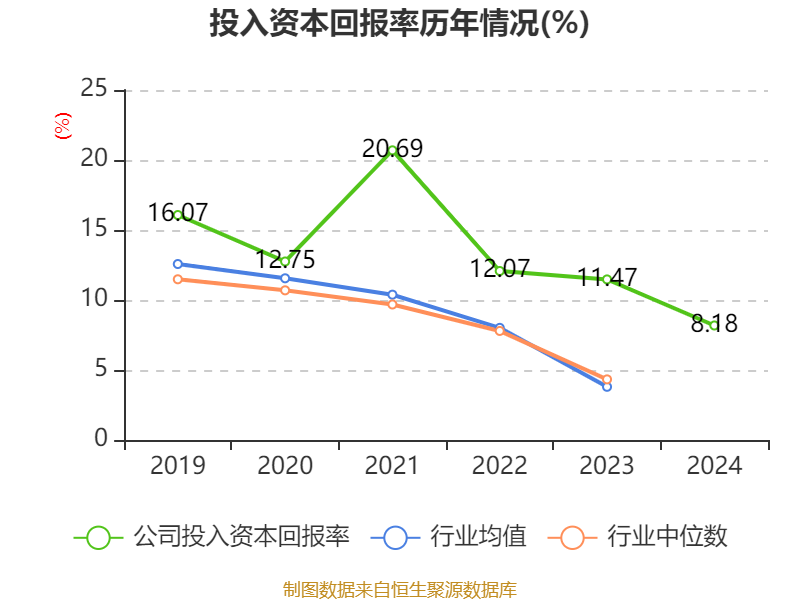 数据显示,2024年公司加权平均净资产收益率为14.29%,较上年同期下降6.13个百分点。公司2024年投入资本回报率为8.18%,较上年同期下降3.29个百分点。
