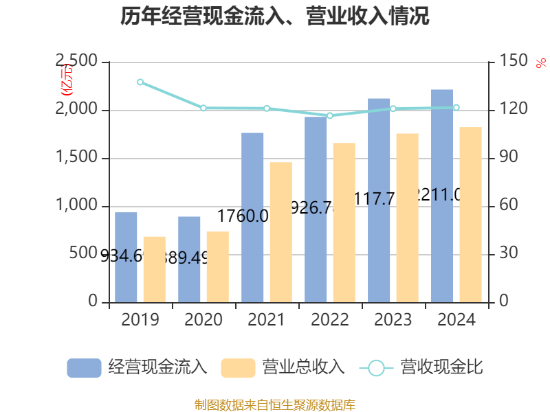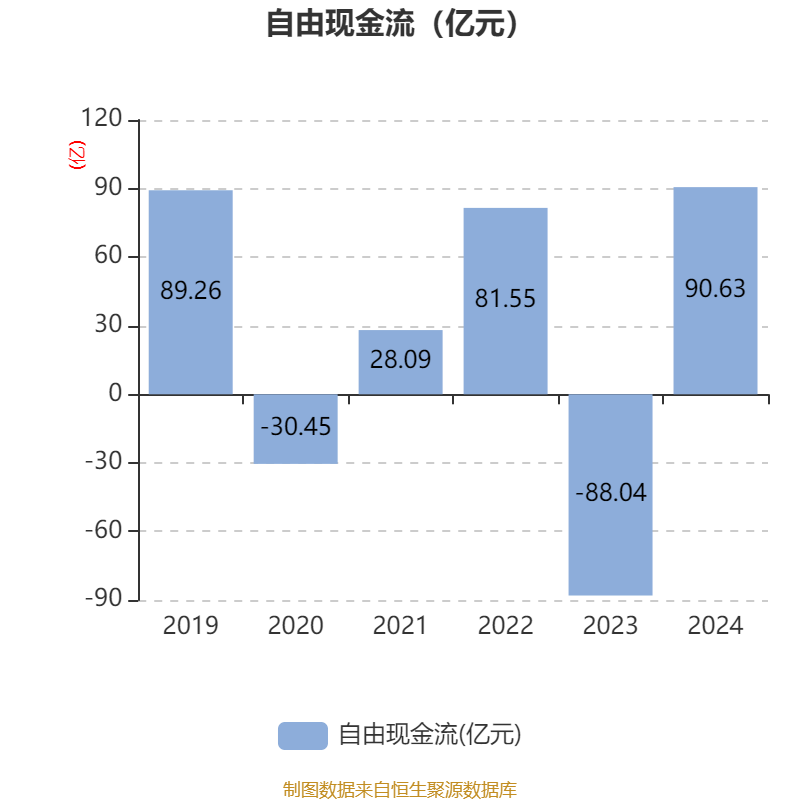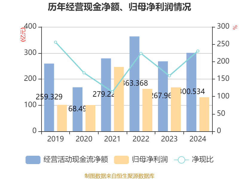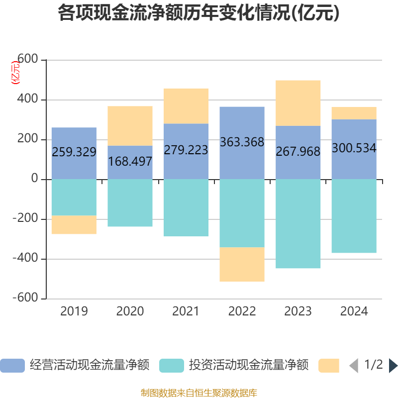 截至2024年,公司经营活动现金流净额为300.53亿元,同比增长12.15%;筹资活动现金流净额61.86亿元,同比减少166.23亿元;投资活动现金流净额-370.78亿元,上年同期为-448.3亿元。