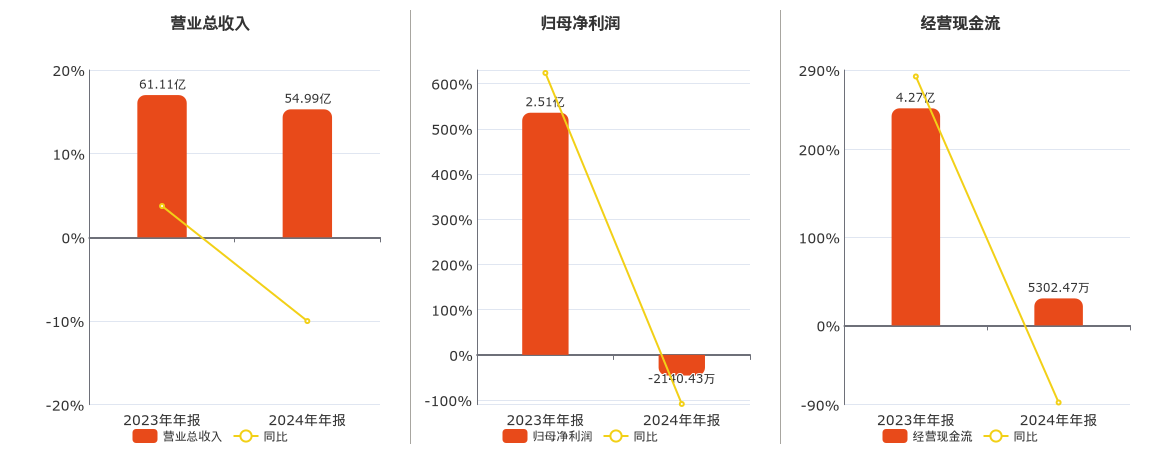 公司营业总收入为54.99亿元,较去年同报告期营业总收入减少6.12亿元,同比较去年同期下降10.01%。归母净利润为-2140.43万元,较去年同报告期归母净利润减少2.72亿元,同比较去年同期下降108.53%。经营活动现金净流入为5302.47万元,较去年同报告期经营活动现金净流入减少3.74亿元,同比较去年同期下降87.58%。