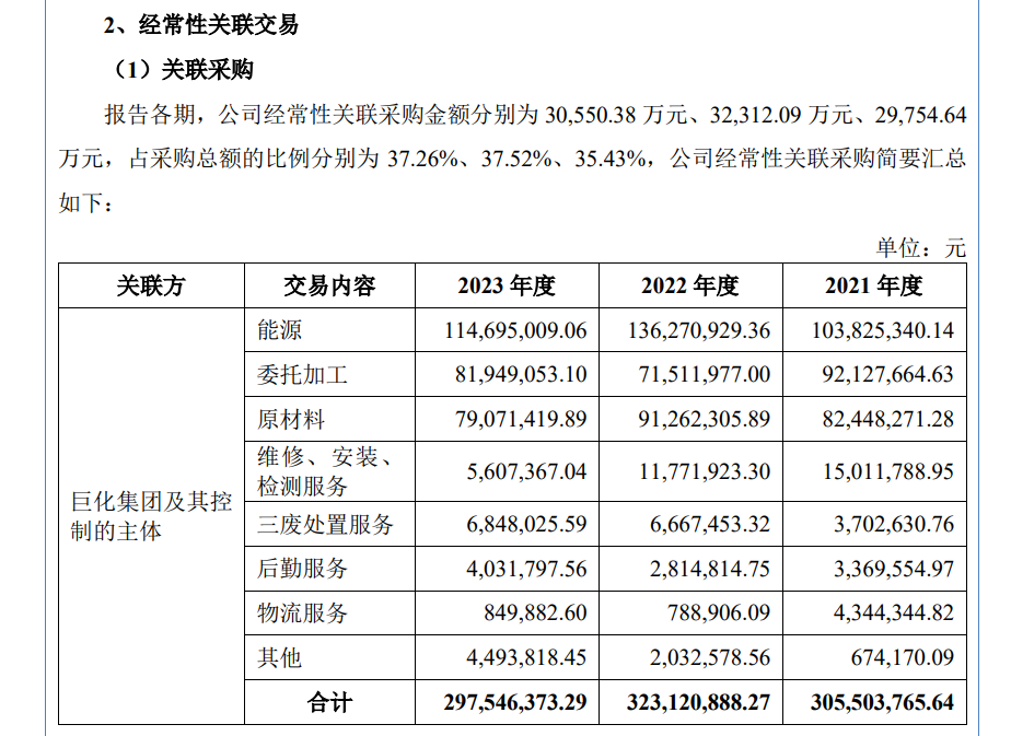 《财中社》注意到,占公司绝大多数股份的巨化集团常年是锦华新材采购占比近40%的供应商,这引发独立性和采购公允性的问询。报告期,公司来自巨化集团及相关方的采购金额分别为3.06亿元、3.23亿元和2.98亿元,占总采购额之比分别为37.26%、37.52%、35.43%,主要系能源、原材料、委托加工、检修安装等服务。公司向关联方巨化锦纶采购丁酮肟的委托加工服务,比向非关联方的价格分别低12.75%、12.78%和0.52%,报告期,锦华新材丁酮肟委托加工服务费为0.92亿元、0.71亿元和0.82亿元,巨化锦纶是巨化集团另一家上市公司巨化股份(600160)的并表全资子公司,这一交易是第二轮问询的重点。