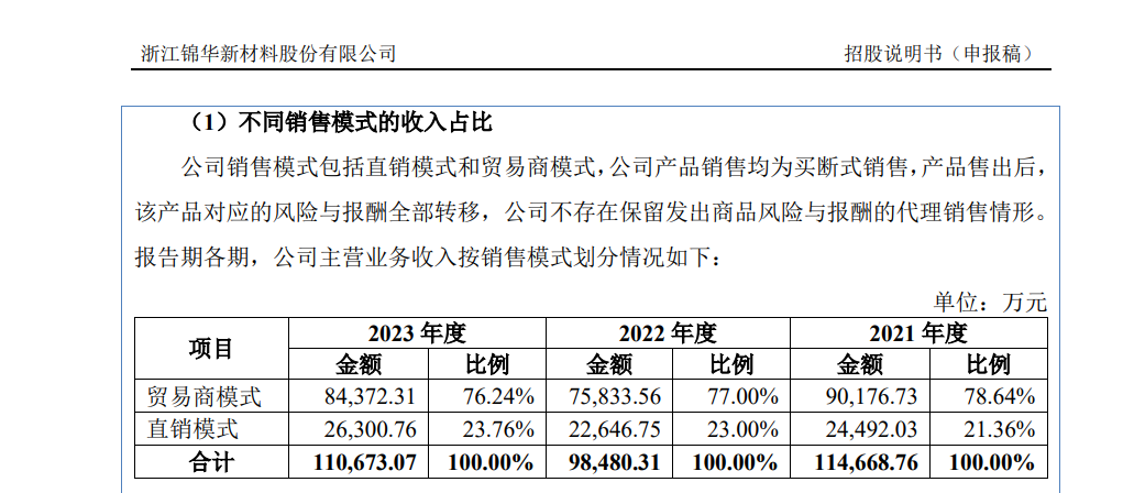 对于主营产品的销售,行业惯例均采用直销模式和贸易商模式,其中,贸易商模式占主导,报告期,锦华新材贸易商模式销售占比超过75%。